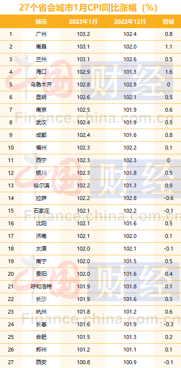 梳理27个省会城市1月份的CPI数据发现,14个城市1月CPI涨幅高于全国水平,其中,广州、南昌、兰州1月CPI涨幅突破3%。分析人士指出,疫情政策放开、服务业消费修复以及“春节错位”推高的1月份物价水平,预计将在2月份有所回落,CPI全面上涨风险不大。