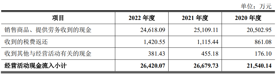 上述同期,公司销售商品、提供劳务收到的现金分别为20,502.95万元、25,109.11万元和24,618.09万元,经营活动产生的现金流量净额分别为6,971.06万元、5,269.07万元和4,158.29万元。