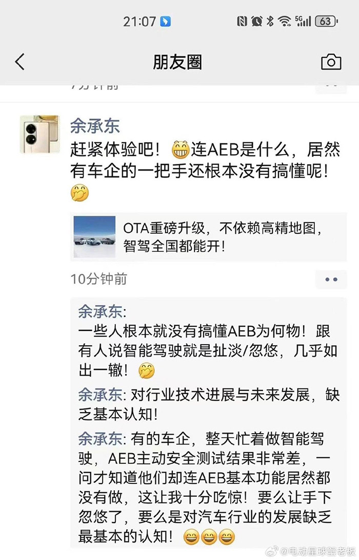 上述言论迅速引发了余承东的回击,他在朋友圈发文称,“连AEB是什么,居然有车企一把手还根本没有搞懂呢!跟有人说智能驾驶就是忽悠,几乎如出一辙!”