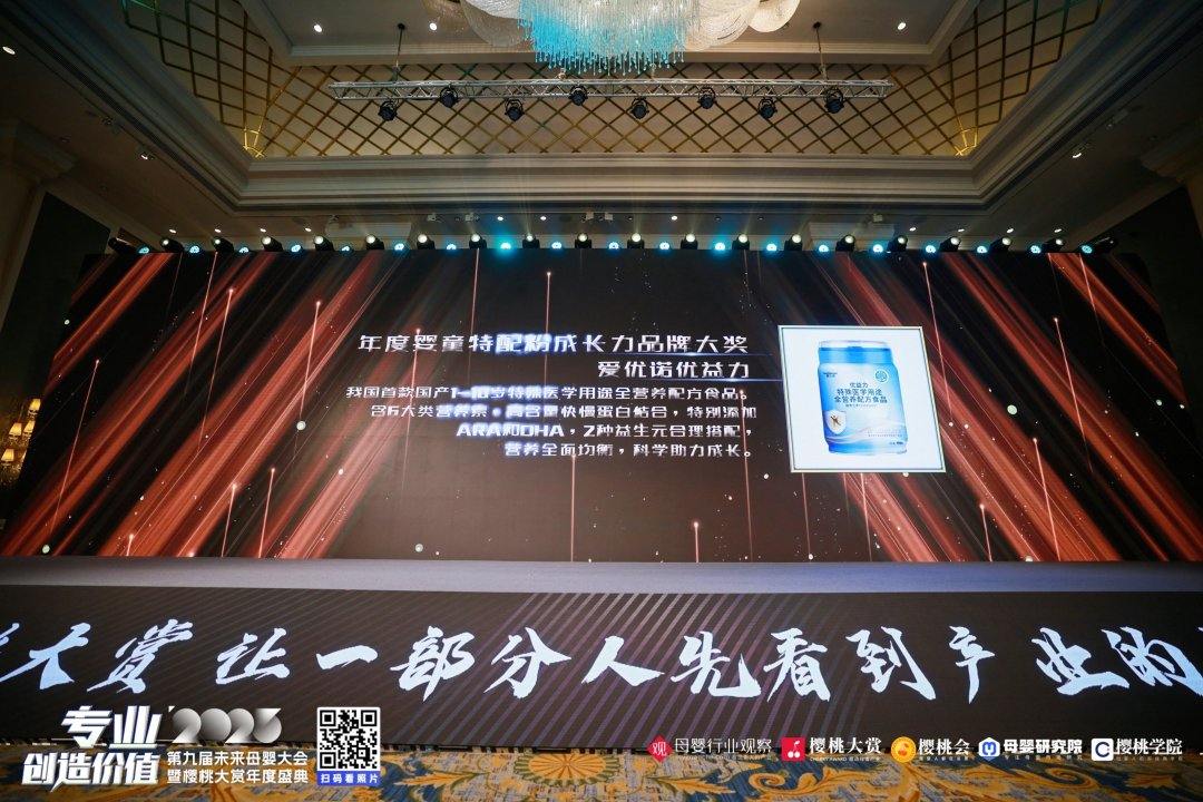 1月11日,由母婴行业观察主办的“专业创造价值·2023第九届樱桃大赏年度盛典”于上海盛大开幕。近百位行业的企业领袖、业内翘楚及资深大咖出席盛会,共谋行业发展,实现资源对碰,并一同见证荣耀时刻。爱优诺凭优益力凭借出色的产品力和创新力,从众多产品中脱颖而出,斩获“年度婴童特配粉成长力品牌大奖”。