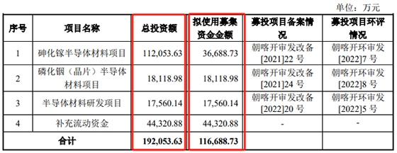 此次IPO,北京通美拟募投项目总投资额为19.21亿元,拟募资额为11.67亿元。注册稿显示,总投资11.21亿元的砷化镓半导体材料项目,将建设形成年产50万片8英寸砷化镓衬底及年产400万片砷化镓衬底(折合2英寸)的生产能力。而北京通美2021年砷化镓衬底(折合2英寸)的产能也才313.64万片,产量为306.68万片。