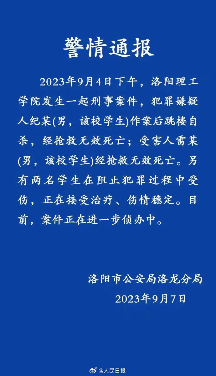 洛阳市公安局洛龙分局7日通报:2023年9月4日下午,洛阳理工学院发生一起刑事案件,犯罪嫌疑人纪某(男,该校学生)作案后跳楼自杀,经抢救无效死亡;受害人雷某(男,该校学生)经抢救无效死亡。另有两名学生在阻止犯罪过程中受伤,正在接受治疗、伤情稳定。目前,案件正在进一步侦办中。(人民日报记者王者)