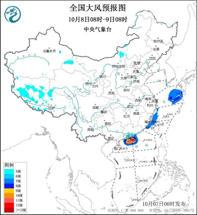10月8日08时至9日08时,东海北部和西南部海域、台湾海峡、南海北部海域将有7~8级、阵风9~10级的大风,其中东海东北部和南海北部的部分海域风力可达9级、阵风10~11级,台风“小犬”中心经过的附近海域风力可达10~13级、阵风14~15级;福建沿海、广东沿海将有6~7级、阵风8级的大风。